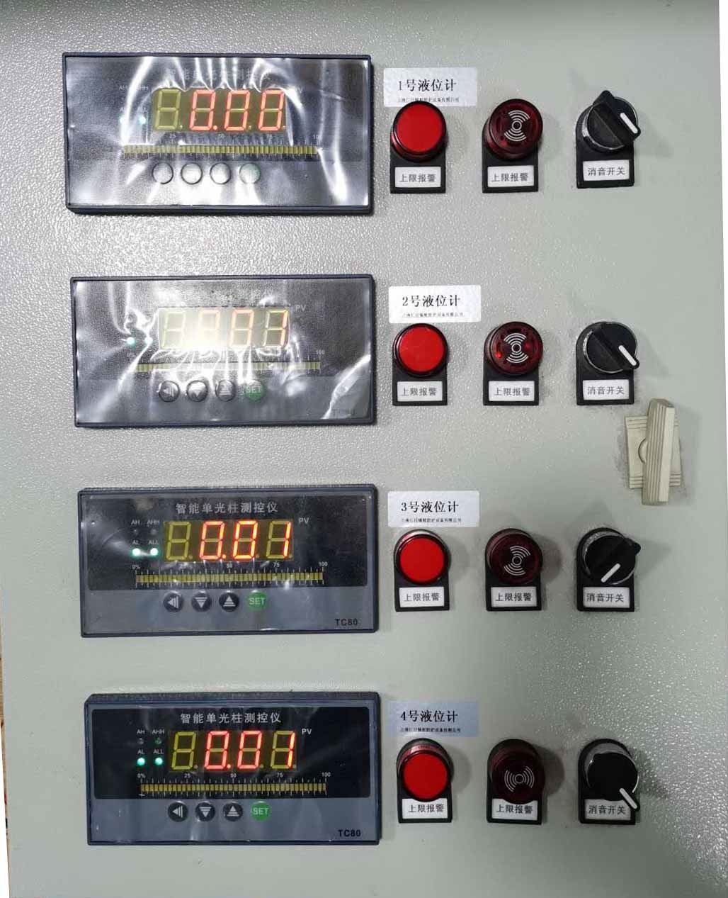 控制柜內部嵌入有多個液位變聲器控制主機,該主機能實時采集液位變送器的數據,并更加設定的報警閾值給出 上下限閾值聲光報警的功能